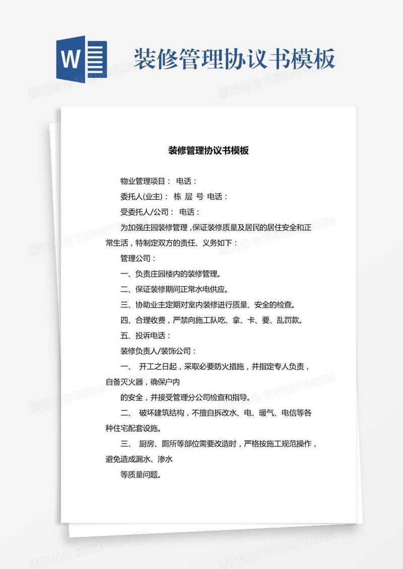 本作品为装修管理协议书模板, 编号:v9lwbr3jja, 格式为 docx, 大小1 MB, 本作品下载后,先解压,解压之后用推荐软件 Word(2010) 打开, 然后进行编辑功能。
