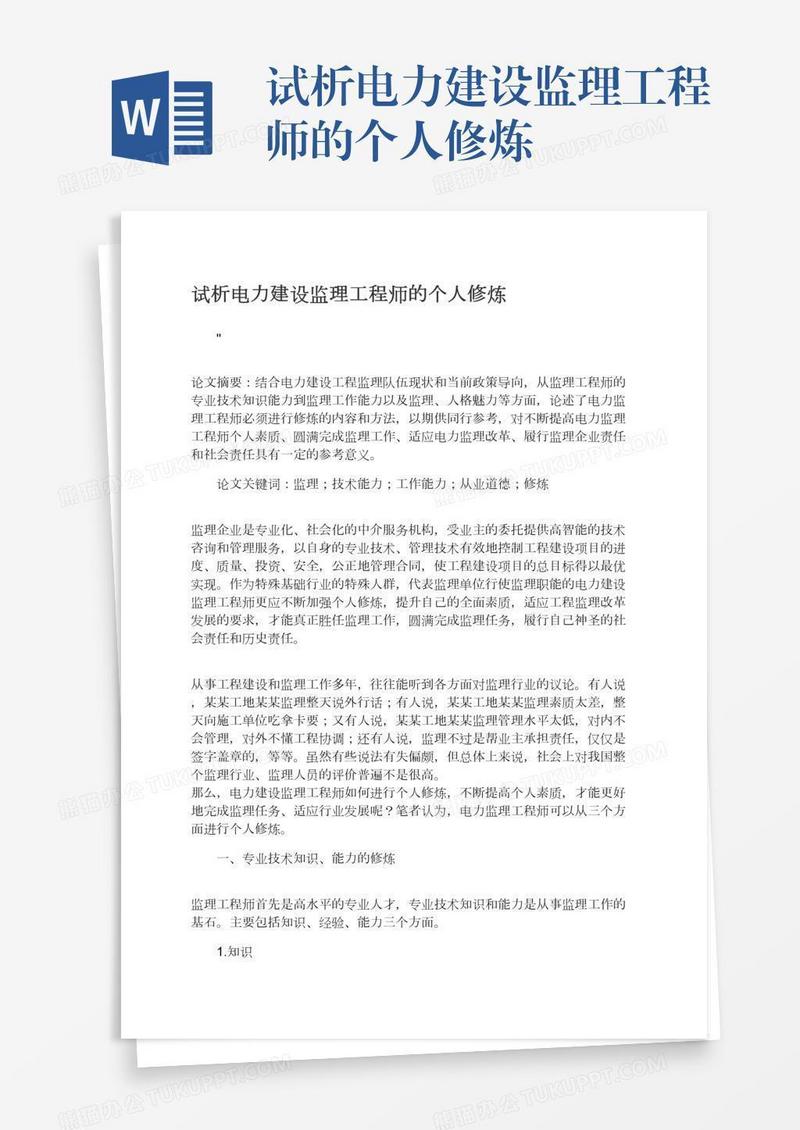 本作品为试析电力建设监理工程师的个人修炼, 编号:v9lwbwbq3a, 格式为 docx, 大小1 MB, 本作品下载后,先解压,解压之后用推荐软件 Word(2010) 打开, 然后进行编辑功能。