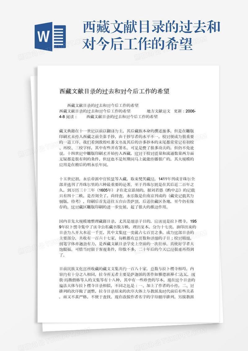 本作品为西藏文献目录的过去和对今后工作的希望, 编号:v9lwbwoyja, 格式为 docx, 大小1 MB, 本作品下载后,先解压,解压之后用推荐软件 Word(2010) 打开, 然后进行编辑功能。
