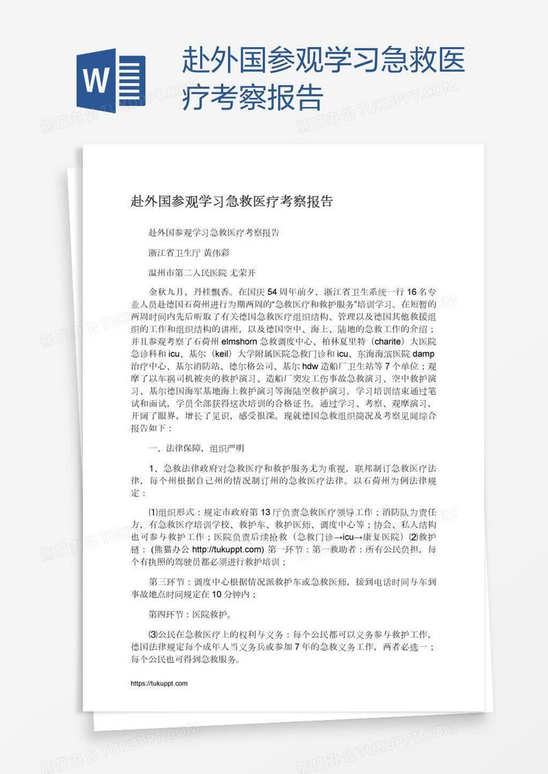 本作品为赴外国参观学习急救医疗考察报告, 编号:v9lwn2vn5a, 格式为 docx, 大小1 MB, 本作品下载后,先解压,解压之后用推荐软件 Word(2010) 打开, 然后进行编辑功能。