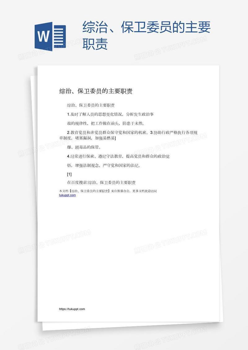 本作品为综治、保卫委员的主要职责, 编号:v9lwn364ja, 格式为 docx, 大小1 MB, 本作品下载后,先解压,解压之后用推荐软件 Word(2010) 打开, 然后进行编辑功能。