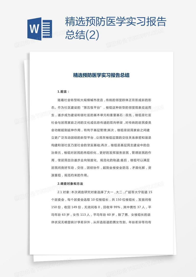 本作品为精选预防医学实习报告总结(2), 编号:v9lwn430ya, 格式为 docx, 大小1 MB, 本作品下载后,先解压,解压之后用推荐软件 Word(2010) 打开, 然后进行编辑功能。
