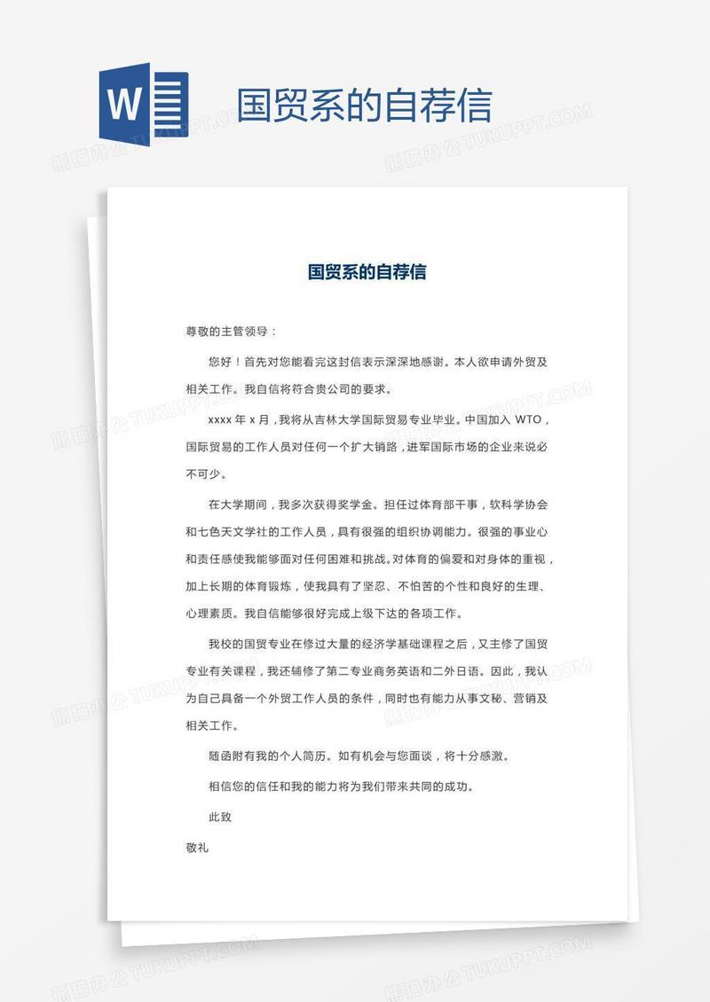 本作品为国贸系的自荐信, 编号:v9lwn4565a, 格式为 docx, 大小1 MB, 本作品下载后,先解压,解压之后用推荐软件 Word(2010) 打开, 然后进行编辑功能。