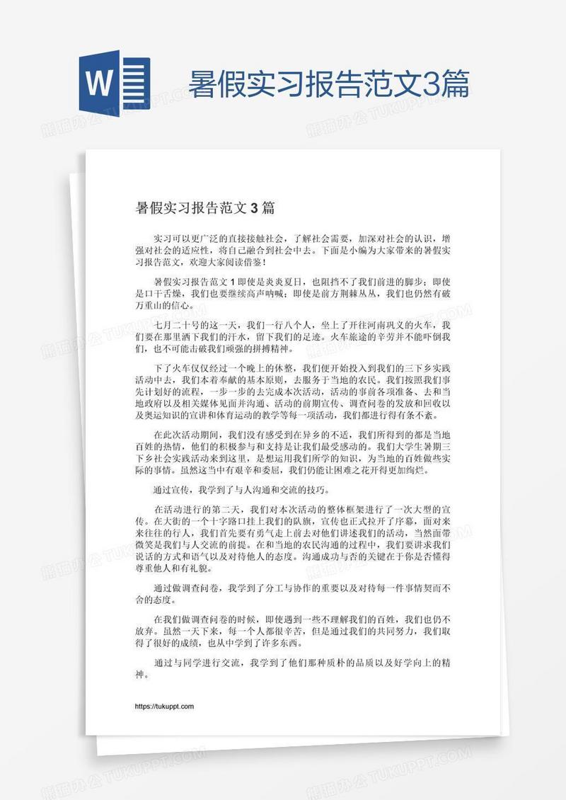 本作品为暑假实习报告范文3篇, 编号:v9lwne2w2a, 格式为 docx, 大小1 MB, 本作品下载后,先解压,解压之后用推荐软件 Word(2010) 打开, 然后进行编辑功能。