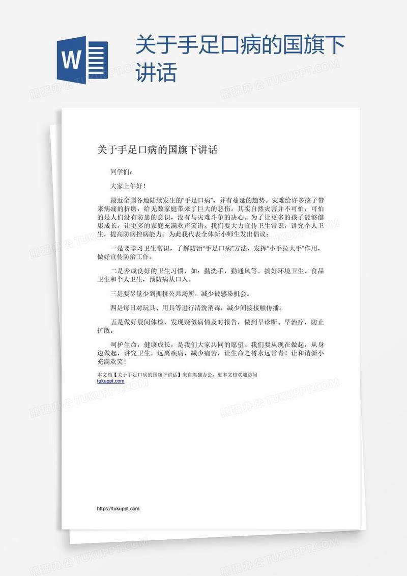 本作品为关于手足口病的国旗下讲话, 编号:v9lwne3oma, 格式为 docx, 大小1 MB, 本作品下载后,先解压,解压之后用推荐软件 Word(2010) 打开, 然后进行编辑功能。