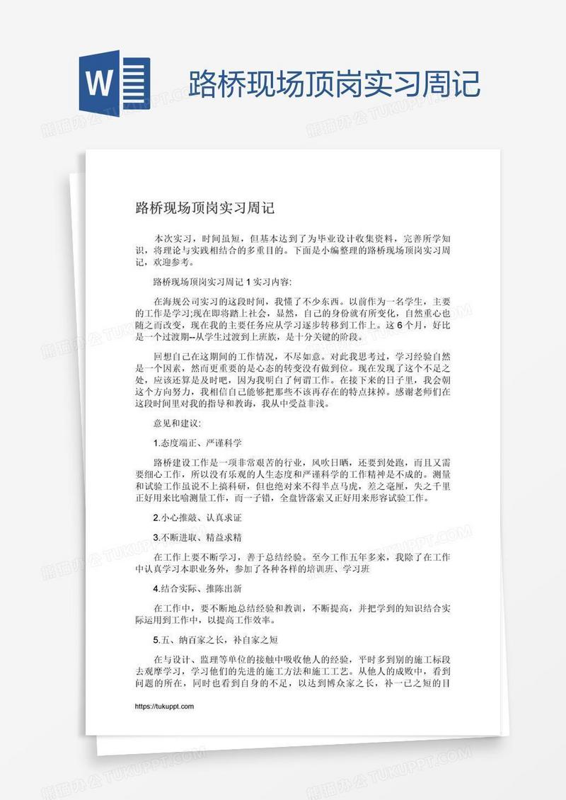 本作品为路桥现场顶岗实习周记, 编号:v9lwnegbja, 格式为 docx, 大小1 MB, 本作品下载后,先解压,解压之后用推荐软件 Word(2010) 打开, 然后进行编辑功能。