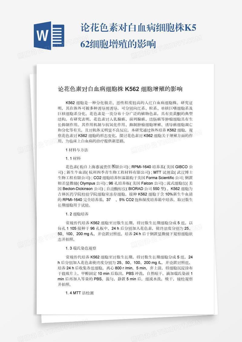 本作品为论花色素对白血病细胞株K562细胞增殖的影响, 编号:v9lwngv52a, 格式为 docx, 大小1 MB, 本作品下载后,先解压,解压之后用推荐软件 Word(2010) 打开, 然后进行编辑功能。