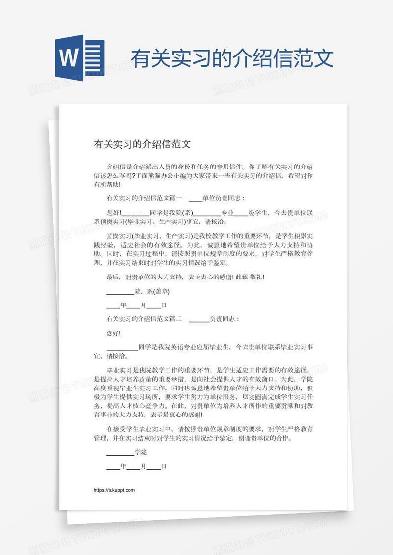 本作品为有关实习的介绍信范文, 编号:v9lwnnbn3a, 格式为 docx, 大小1 MB, 本作品下载后,先解压,解压之后用推荐软件 Word(2010) 打开, 然后进行编辑功能。