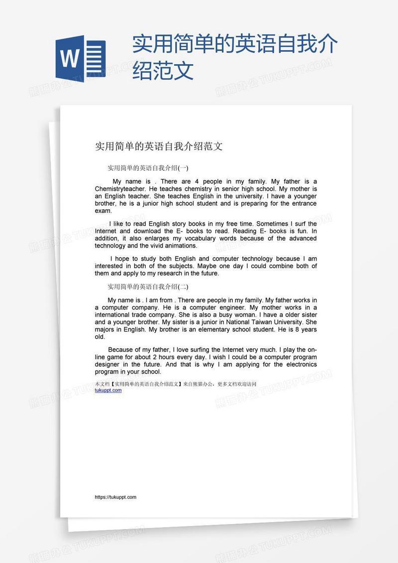 本作品为实用简单的英语自我介绍范文, 编号:v9lwnp3m3a, 格式为 docx, 大小1 MB, 本作品下载后,先解压,解压之后用推荐软件 Word(2010) 打开, 然后进行编辑功能。