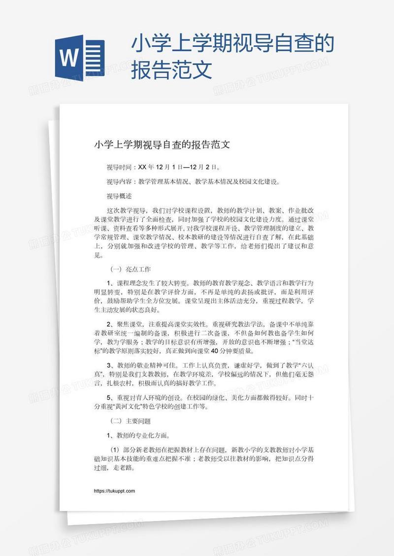 本作品为小学上学期视导自查的报告范文, 编号:v9lwnw3dya, 格式为 docx, 大小1 MB, 本作品下载后,先解压,解压之后用推荐软件 Word(2010) 打开, 然后进行编辑功能。