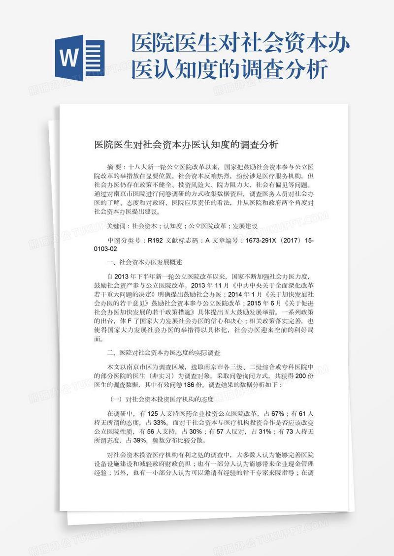 本作品为医院医生对社会资本办医认知度的调查分析, 编号:w94go22gn9, 格式为 docx, 大小1 MB, 本作品下载后,先解压,解压之后用推荐软件 Word(2010) 打开, 然后进行编辑功能。