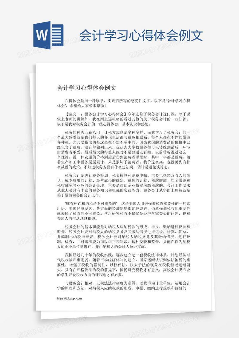 本作品为会计学习心得体会例文, 编号:w94go37gn9, 格式为 docx, 大小1 MB, 本作品下载后,先解压,解压之后用推荐软件 Word(2010) 打开, 然后进行编辑功能。