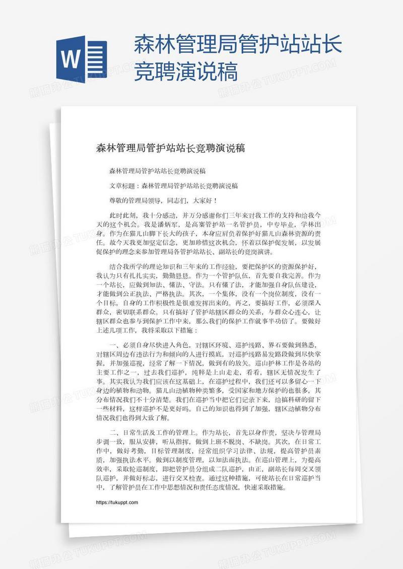 本作品为森林管理局管护站站长竞聘演说稿, 编号:w94go8w0k9, 格式为 docx, 大小1 MB, 本作品下载后,先解压,解压之后用推荐软件 Word(2010) 打开, 然后进行编辑功能。