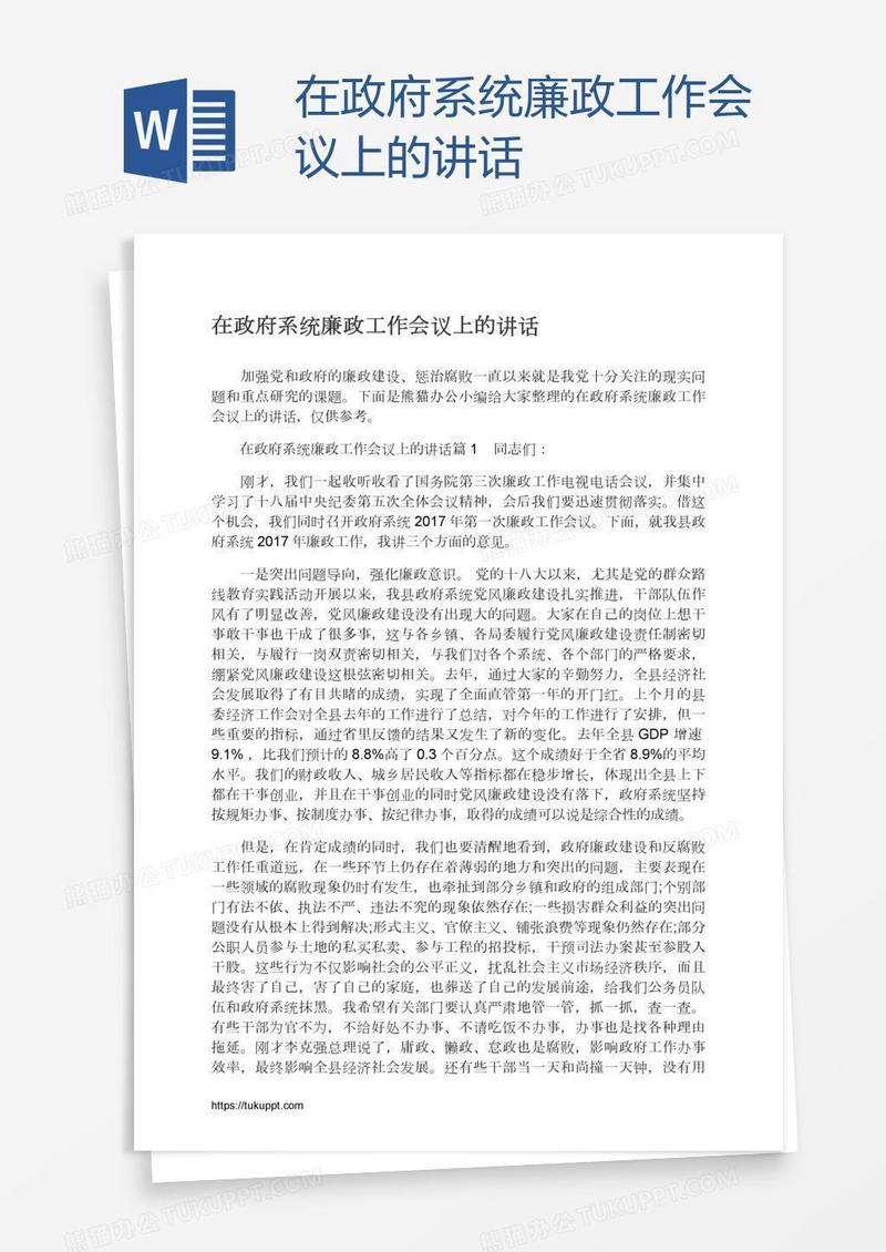本作品为在政府系统廉政工作会议上的讲话, 编号:w94gob04l9, 格式为 docx, 大小1 MB, 本作品下载后,先解压,解压之后用推荐软件 Word(2010) 打开, 然后进行编辑功能。