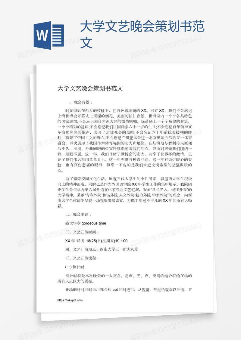 本作品为大学文艺晚会策划书范文, 编号:w94godywk9, 格式为 docx, 大小1 MB, 本作品下载后,先解压,解压之后用推荐软件 Word(2010) 打开, 然后进行编辑功能。