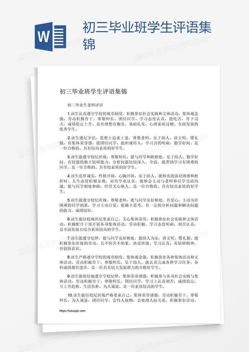 本作品为初三毕业班学生评语集锦, 编号:w94gogmgl9, 格式为 docx, 大小1 MB, 本作品下载后,先解压,解压之后用推荐软件 Word(2010) 打开, 然后进行编辑功能。