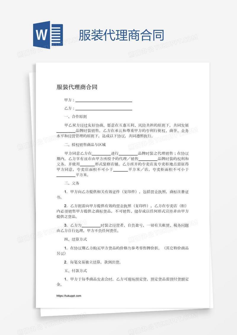 本作品为服装代理商合同, 编号:w94gonobj9, 格式为 docx, 大小1 MB, 本作品下载后,先解压,解压之后用推荐软件 Word(2010) 打开, 然后进行编辑功能。