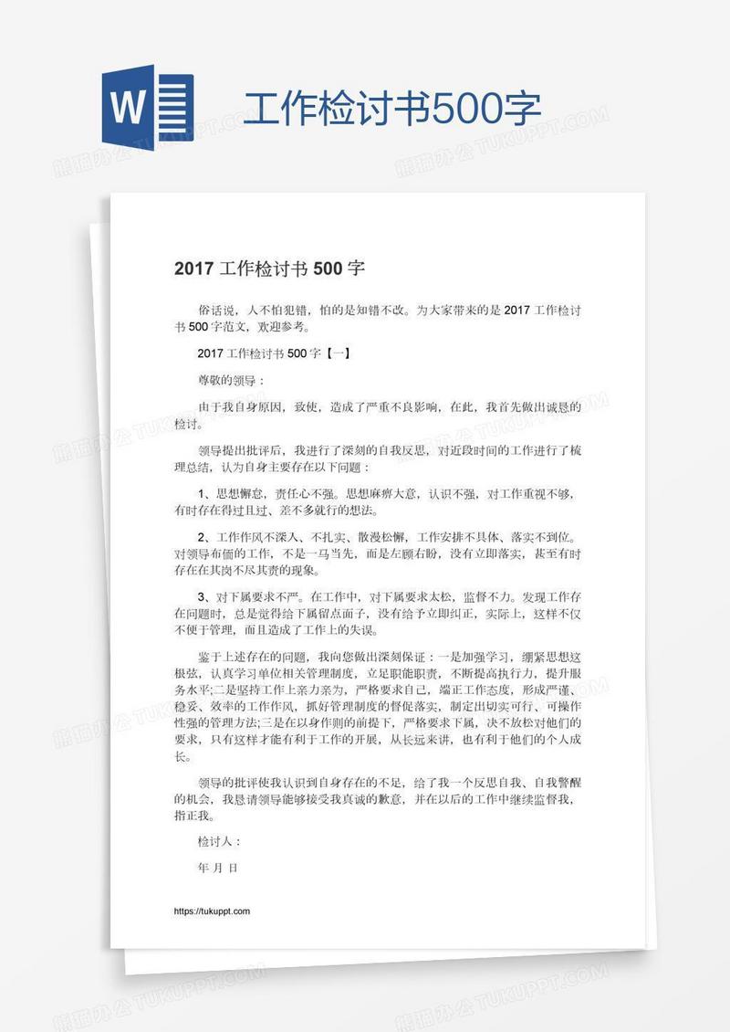 本作品为工作检讨书500字, 编号:w94goo0l09, 格式为 docx, 大小1 MB, 本作品下载后,先解压,解压之后用推荐软件 Word(2010) 打开, 然后进行编辑功能。