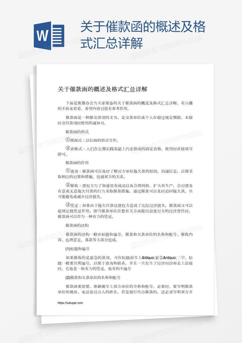 本作品为关于催款函的概述及格式汇总详解, 编号:w94gooepj9, 格式为 docx, 大小1 MB, 本作品下载后,先解压,解压之后用推荐软件 Word(2010) 打开, 然后进行编辑功能。