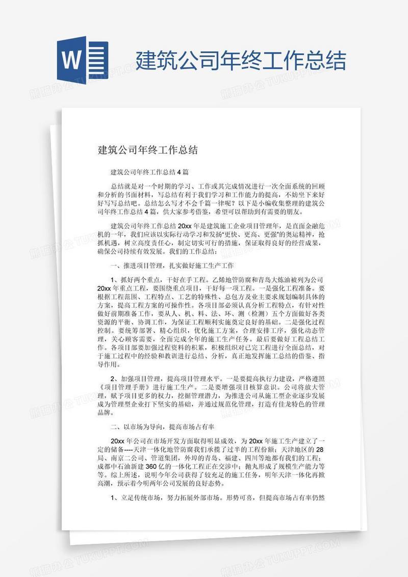 本作品为建筑公司年终工作总结, 编号:w94gp0lp09, 格式为 docx, 大小1 MB, 本作品下载后,先解压,解压之后用推荐软件 Word(2010) 打开, 然后进行编辑功能。