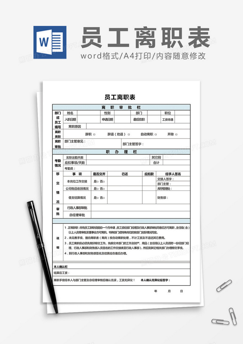 本作品为实用公司员工离职表word模板, 编号:w94gpbjej9, 格式为 docx, 大小1 MB, 本作品下载后,先解压,解压之后用推荐软件 Word(2010) 打开, 然后进行编辑功能。
