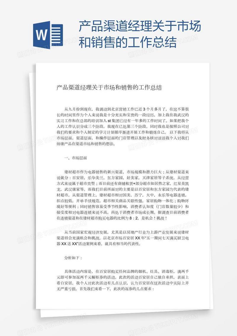 本作品为产品渠道经理关于市场和销售的工作总结, 编号:w94gpjv2n9, 格式为 docx, 大小1 MB, 本作品下载后,先解压,解压之后用推荐软件 Word(2010) 打开, 然后进行编辑功能。