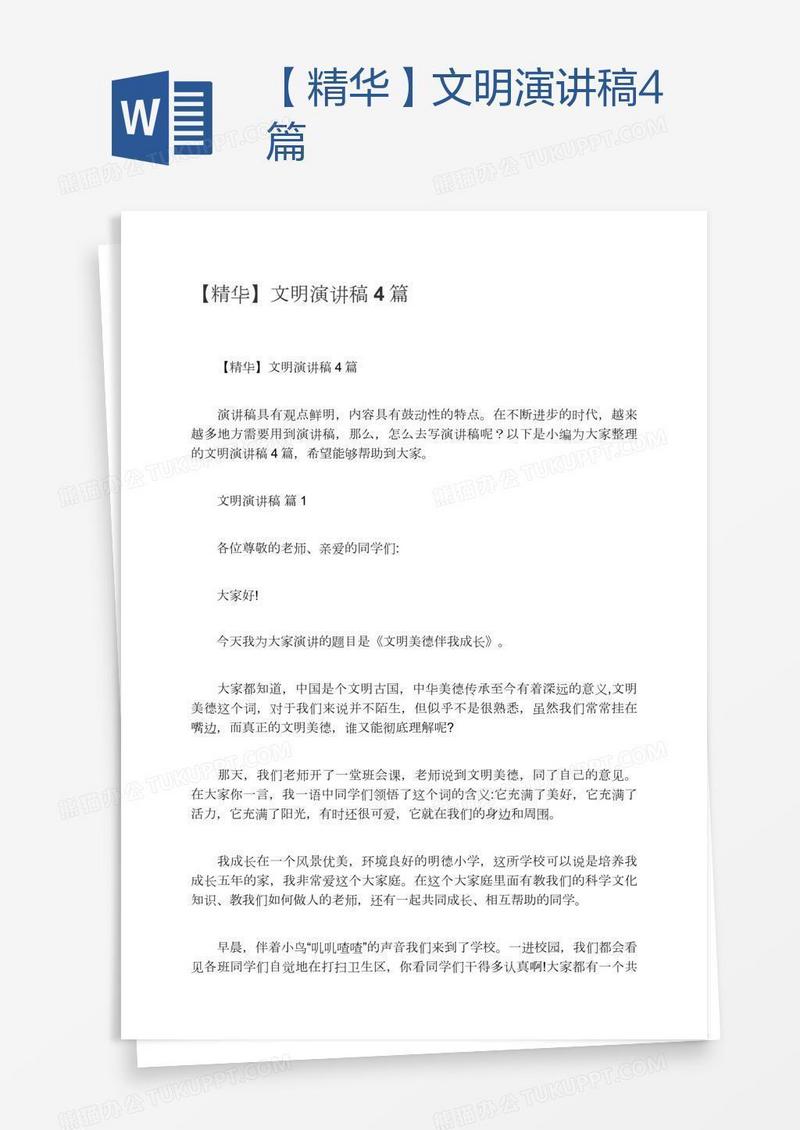 本作品为【精华】文明演讲稿4篇, 编号:w94gpmblk9, 格式为 docx, 大小1 MB, 本作品下载后,先解压,解压之后用推荐软件 Word(2010) 打开, 然后进行编辑功能。