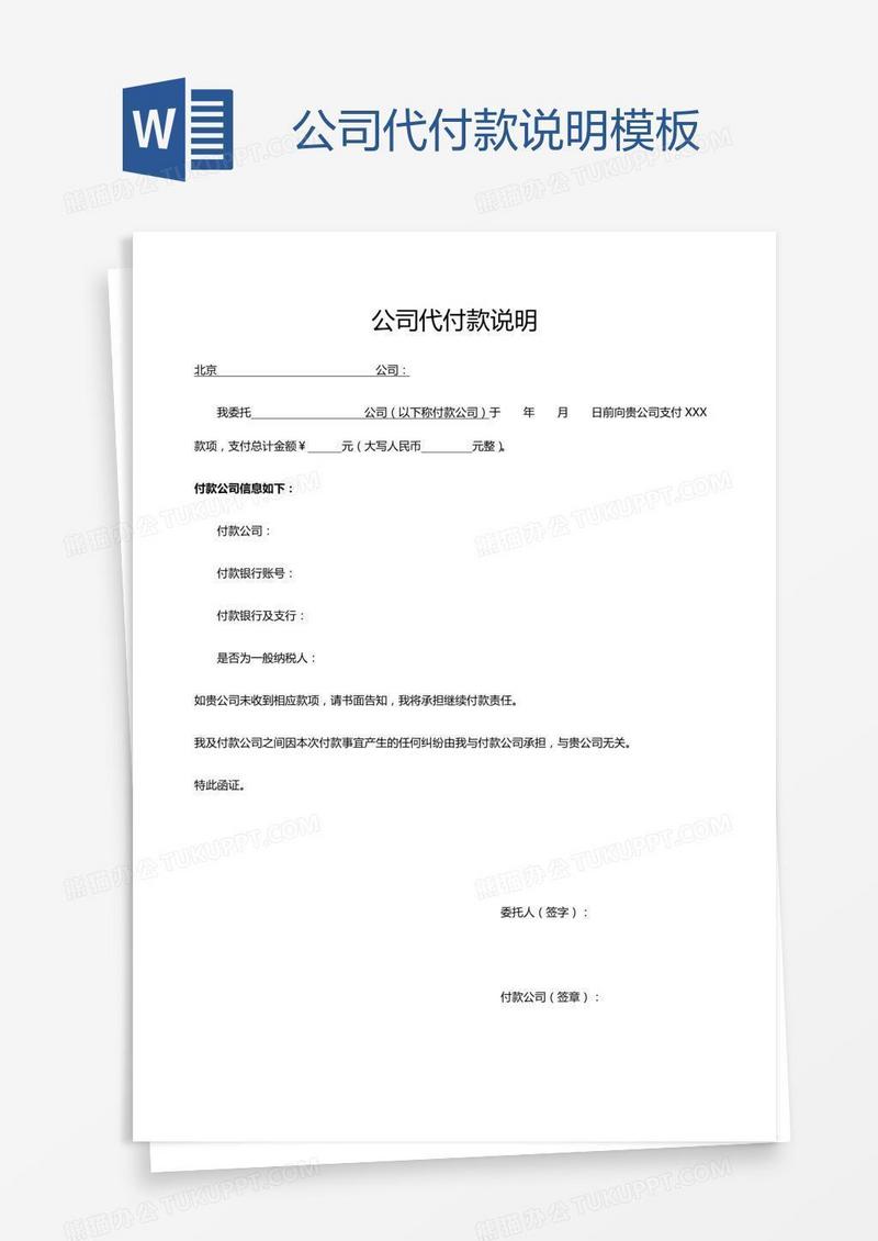 本作品为公司代付款说明模板, 编号:w94gpw8lj9, 格式为 docx, 大小1 MB, 本作品下载后,先解压,解压之后用推荐软件 Word(2010) 打开, 然后进行编辑功能。