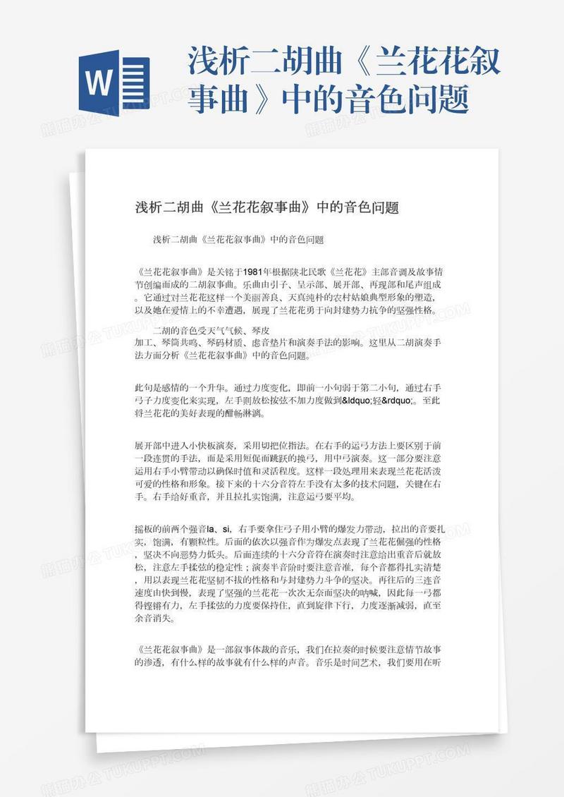 本作品为浅析二胡曲《兰花花叙事曲》中的音色问题, 编号:w94gqd3k09, 格式为 docx, 大小1 MB, 本作品下载后,先解压,解压之后用推荐软件 Word(2010) 打开, 然后进行编辑功能。