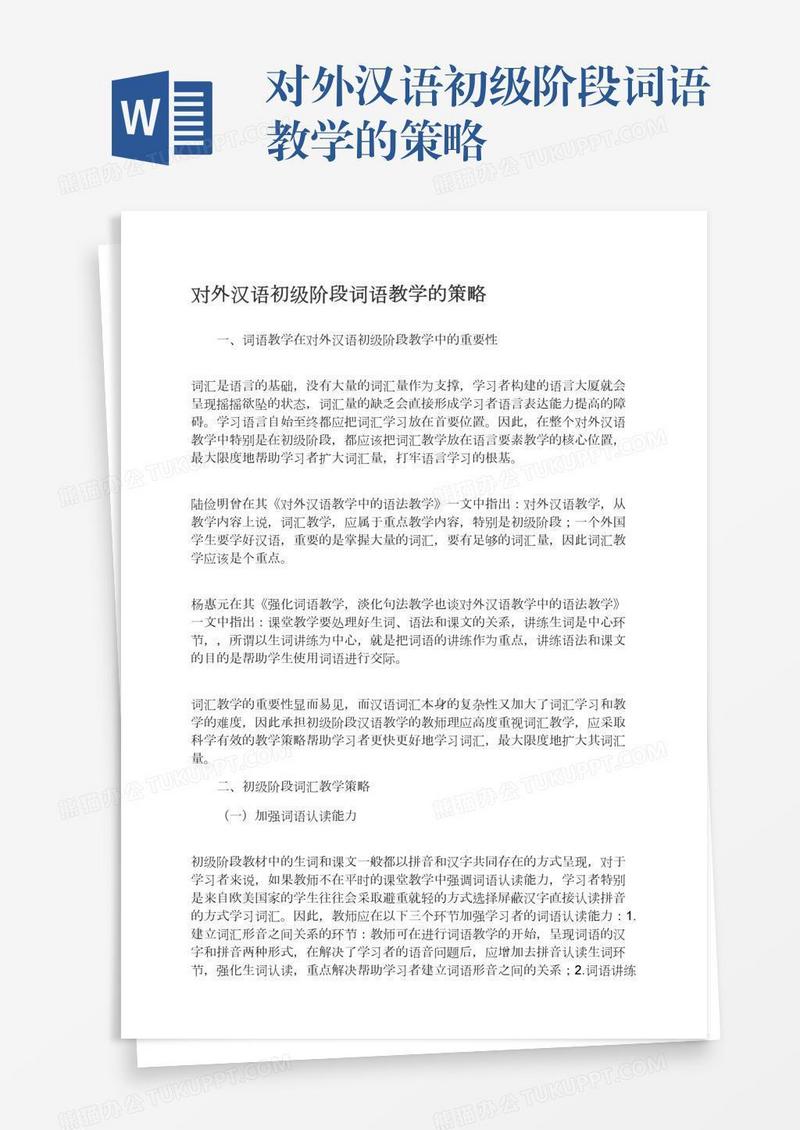 本作品为对外汉语初级阶段词语教学的策略, 编号:w94gqdbo09, 格式为 docx, 大小1 MB, 本作品下载后,先解压,解压之后用推荐软件 Word(2010) 打开, 然后进行编辑功能。