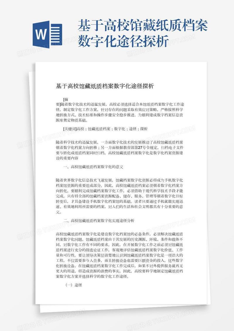 本作品为基于高校馆藏纸质档案数字化途径探析, 编号:w94gqdjl09, 格式为 docx, 大小1 MB, 本作品下载后,先解压,解压之后用推荐软件 Word(2010) 打开, 然后进行编辑功能。