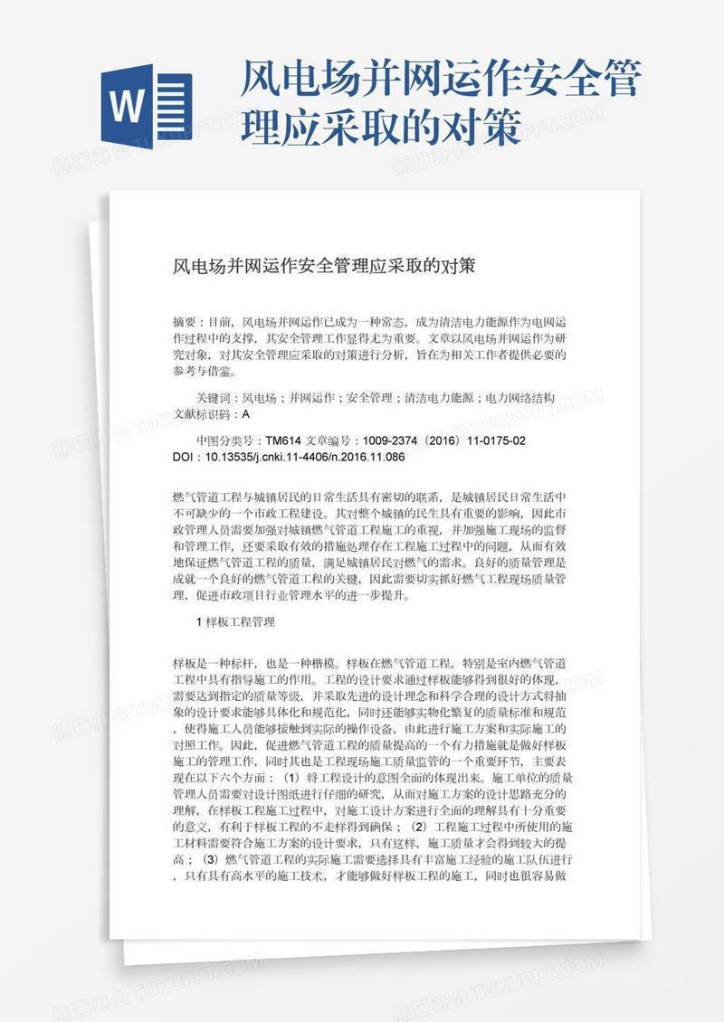 本作品为风电场并网运作安全管理应采取的对策, 编号:w94gqk6gl9, 格式为 docx, 大小1 MB, 本作品下载后,先解压,解压之后用推荐软件 Word(2010) 打开, 然后进行编辑功能。