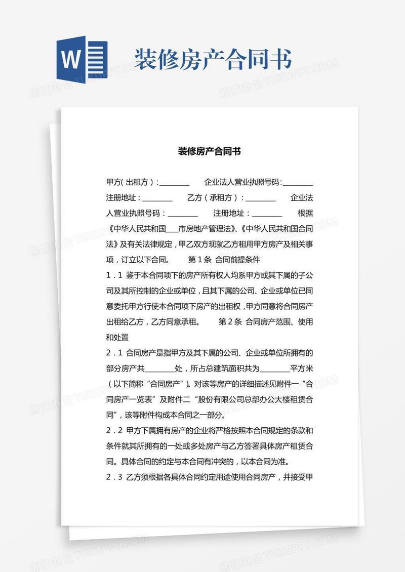本作品为装修房产合同书, 编号:w94gqnl549, 格式为 docx, 大小1 MB, 本作品下载后,先解压,解压之后用推荐软件 Word(2010) 打开, 然后进行编辑功能。