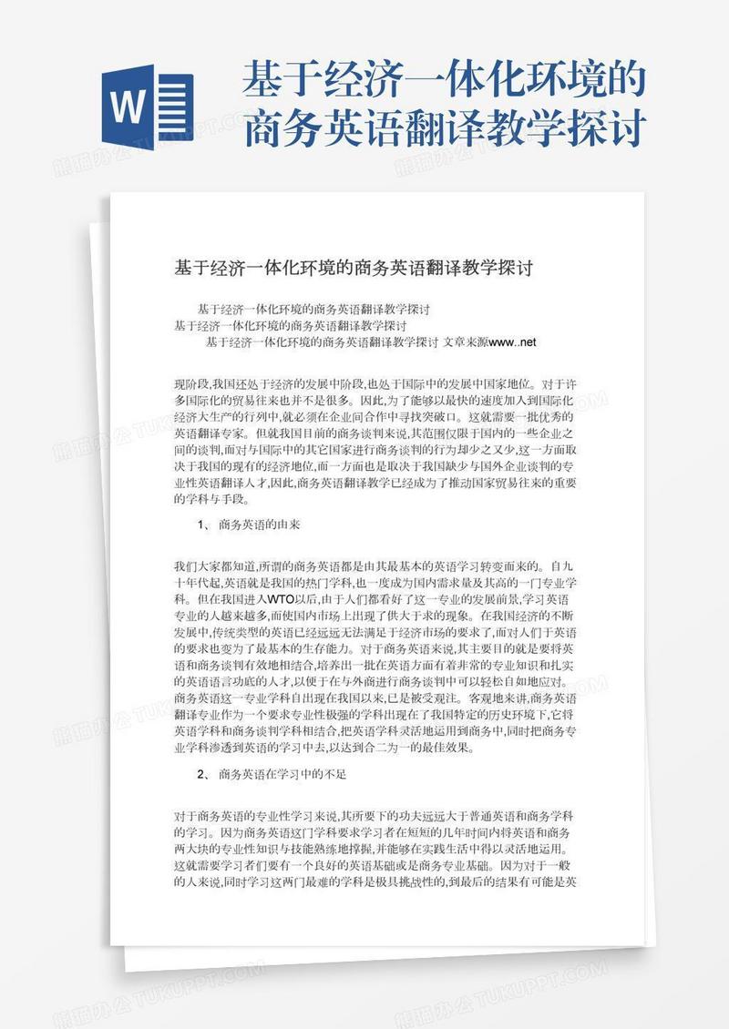 本作品为基于经济一体化环境的商务英语翻译教学探讨, 编号:w94gqpmg49, 格式为 docx, 大小1 MB, 本作品下载后,先解压,解压之后用推荐软件 Word(2010) 打开, 然后进行编辑功能。