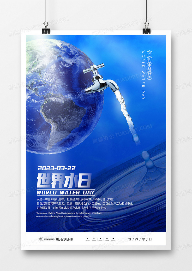 本作品为蓝色简约大气世界水日宣传海报, 编号:w94gqwp7k9, 格式为 psd, 大小139 MB, 本作品下载后,先解压,解压之后用推荐软件 PhotoShop(CC) 打开, 然后进行编辑功能。