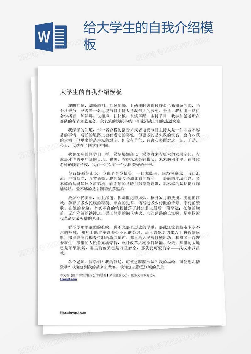 本作品为给大学生的自我介绍模板, 编号:w9jv00nyj9, 格式为 docx, 大小1 MB, 本作品下载后,先解压,解压之后用推荐软件 Word(2010) 打开, 然后进行编辑功能。