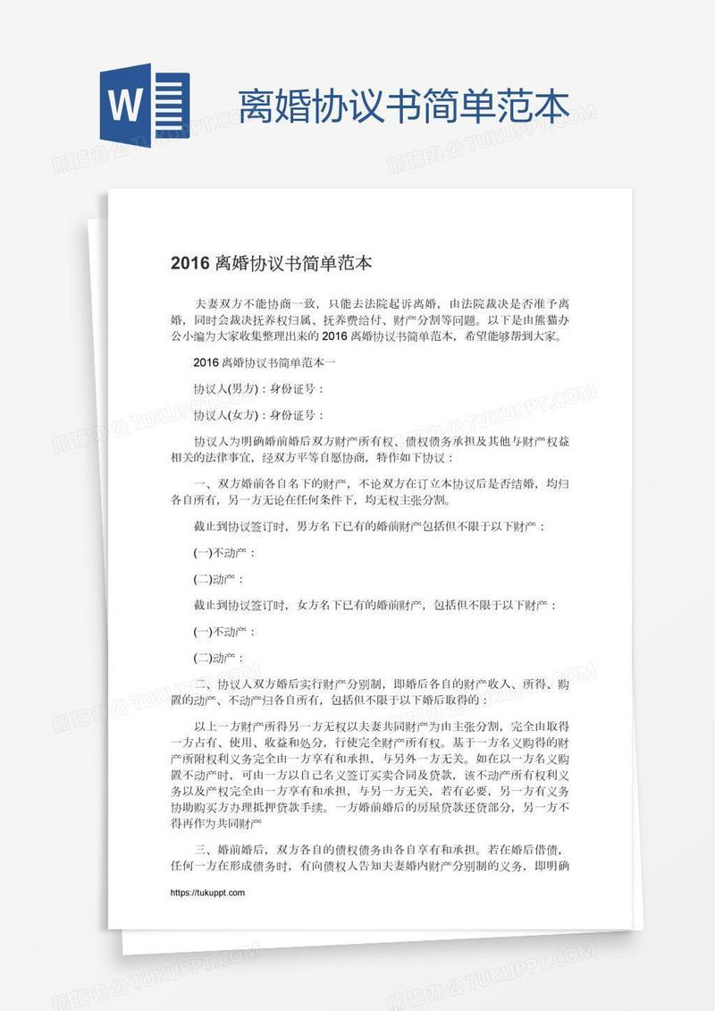 本作品为离婚协议书简单范本, 编号:w9jv00ym49, 格式为 docx, 大小1 MB, 本作品下载后,先解压,解压之后用推荐软件 Word(2010) 打开, 然后进行编辑功能。