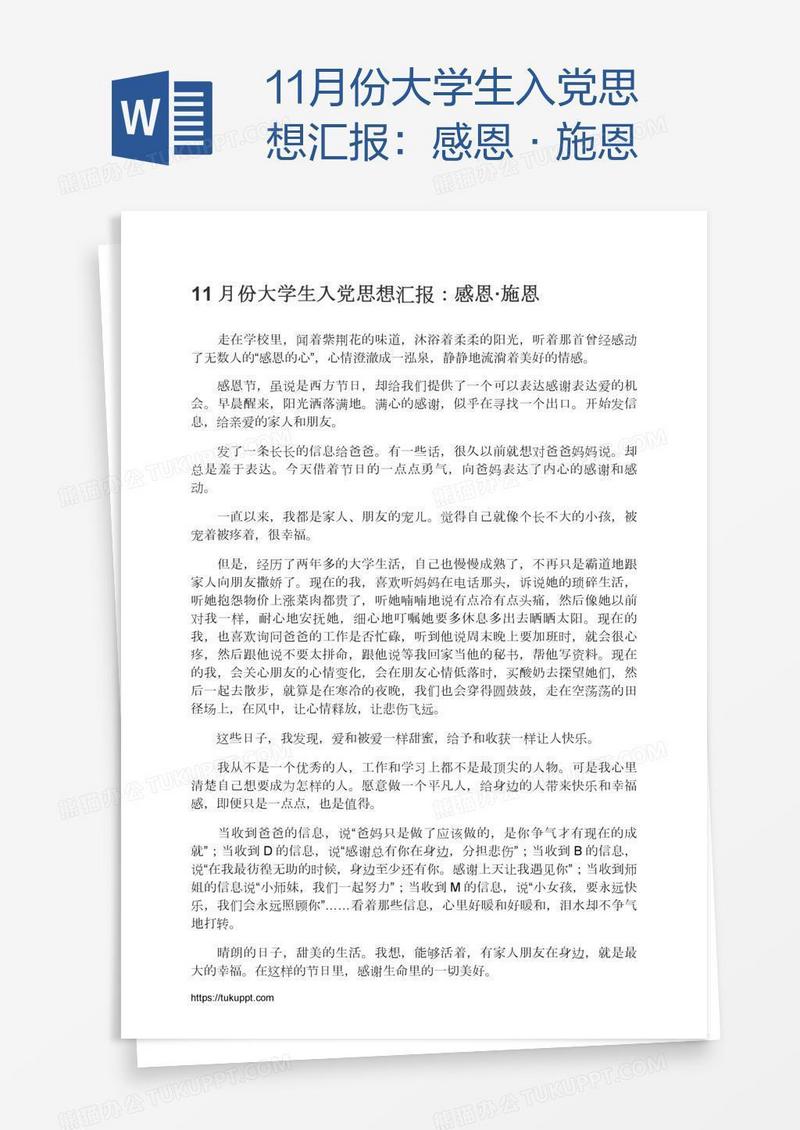 本作品为11月份大学生入党思想汇报:感恩·施恩, 编号:w9jv02lo09, 格式为 docx, 大小1 MB, 本作品下载后,先解压,解压之后用推荐软件 Word(2010) 打开, 然后进行编辑功能。