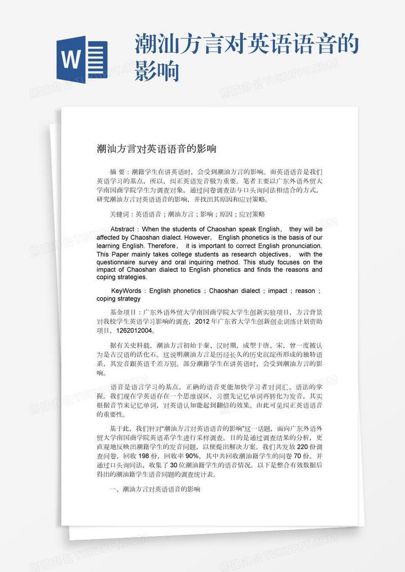 本作品为潮汕方言对英语语音的影响, 编号:w9jv04n2j9, 格式为 docx, 大小1 MB, 本作品下载后,先解压,解压之后用推荐软件 Word(2010) 打开, 然后进行编辑功能。