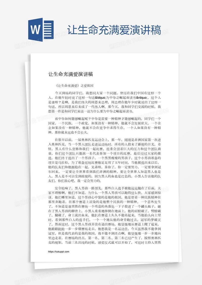 本作品为让生命充满爱演讲稿, 编号:w9jv050609, 格式为 docx, 大小1 MB, 本作品下载后,先解压,解压之后用推荐软件 Word(2010) 打开, 然后进行编辑功能。