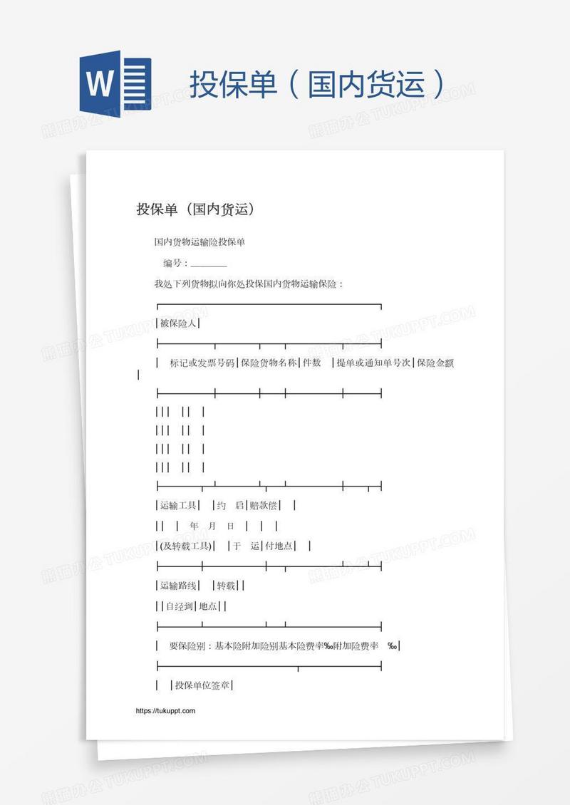 本作品为投保单(国内货运), 编号:w9jv07j0r9, 格式为 docx, 大小1 MB, 本作品下载后,先解压,解压之后用推荐软件 Word(2010) 打开, 然后进行编辑功能。