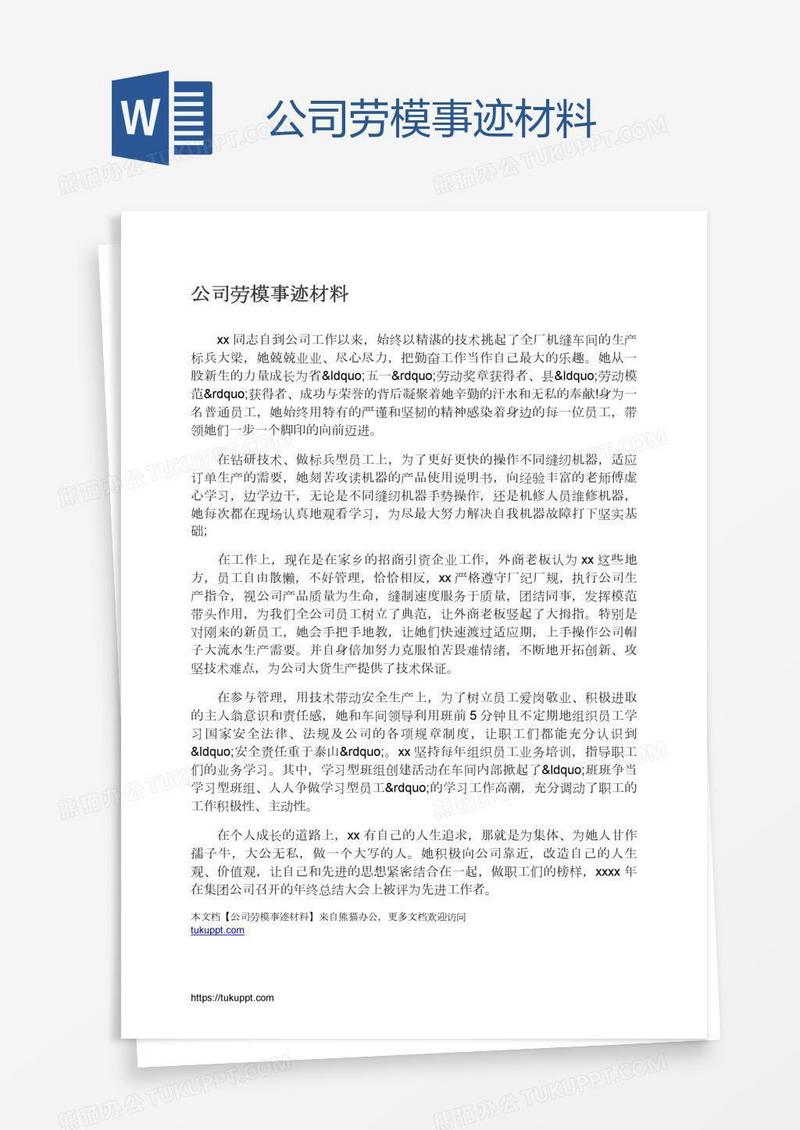 本作品为公司劳模事迹材料, 编号:w9jv07mlr9, 格式为 docx, 大小1 MB, 本作品下载后,先解压,解压之后用推荐软件 Word(2010) 打开, 然后进行编辑功能。