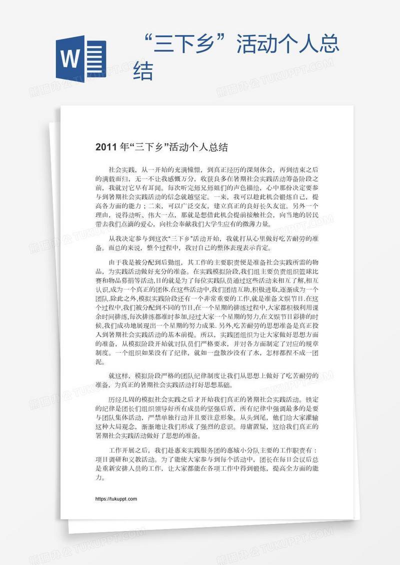 本作品为“三下乡”活动个人总结, 编号:w9jv0br5g9, 格式为 docx, 大小1 MB, 本作品下载后,先解压,解压之后用推荐软件 Word(2010) 打开, 然后进行编辑功能。