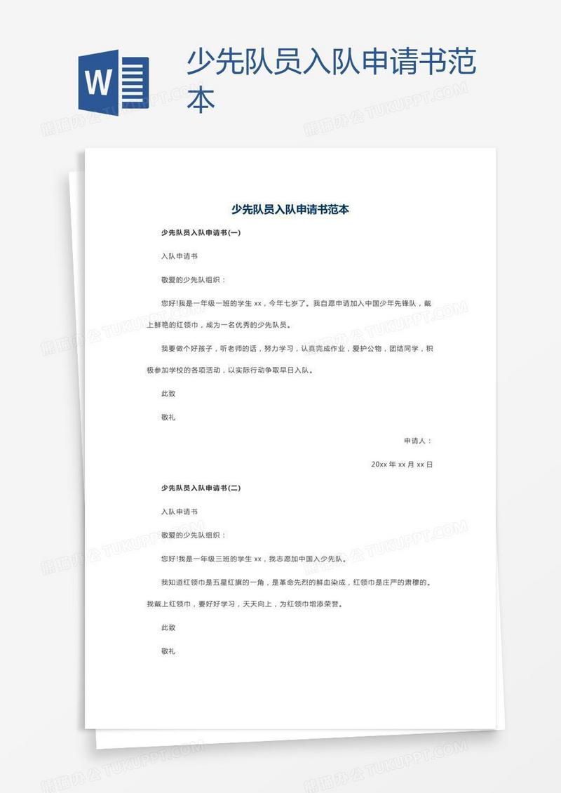 本作品为少先队员入队申请书范本, 编号:w9jv0k3j09, 格式为 docx, 大小1 MB, 本作品下载后,先解压,解压之后用推荐软件 Word(2010) 打开, 然后进行编辑功能。
