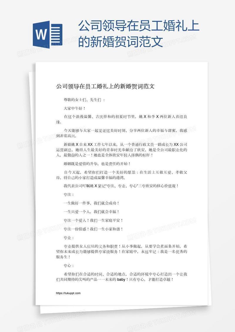 本作品为公司领导在员工婚礼上的新婚贺词范文, 编号:w9jv0v5jj9, 格式为 docx, 大小1 MB, 本作品下载后,先解压,解压之后用推荐软件 Word(2010) 打开, 然后进行编辑功能。