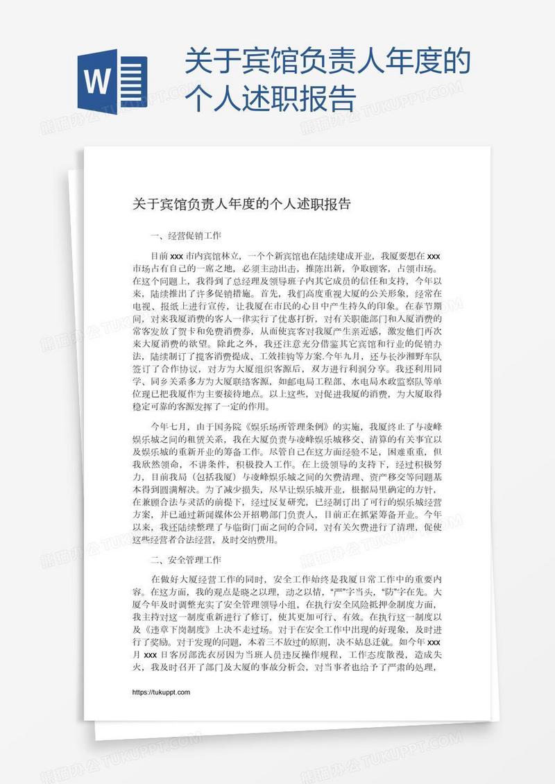本作品为关于宾馆负责人年度的个人述职报告, 编号:w9jv0vo2g9, 格式为 docx, 大小1 MB, 本作品下载后,先解压,解压之后用推荐软件 Word(2010) 打开, 然后进行编辑功能。