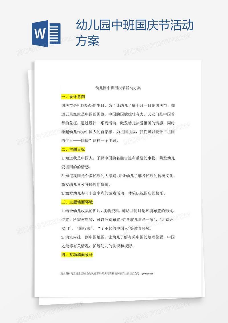 本作品为幼儿园中班国庆节活动方案, 编号:w9jve46dr9, 格式为 doc, 大小1 MB, 本作品下载后,先解压,解压之后用推荐软件 Word(2010) 打开, 然后进行编辑功能。