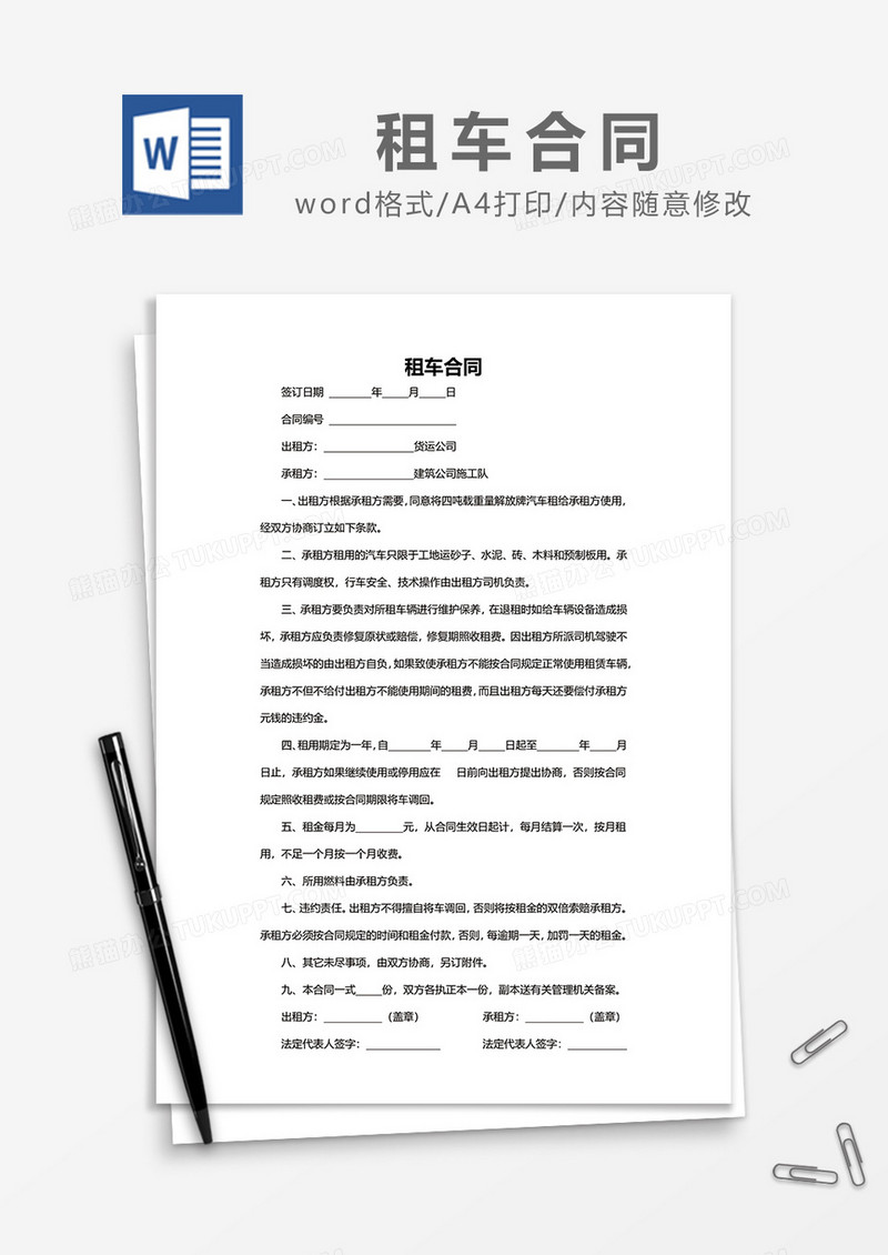 本作品为简约租车合同word模板, 编号:w9jvegy2g9, 格式为 docx, 大小1 MB, 本作品下载后,先解压,解压之后用推荐软件 Word(2016) 打开, 然后进行编辑功能。