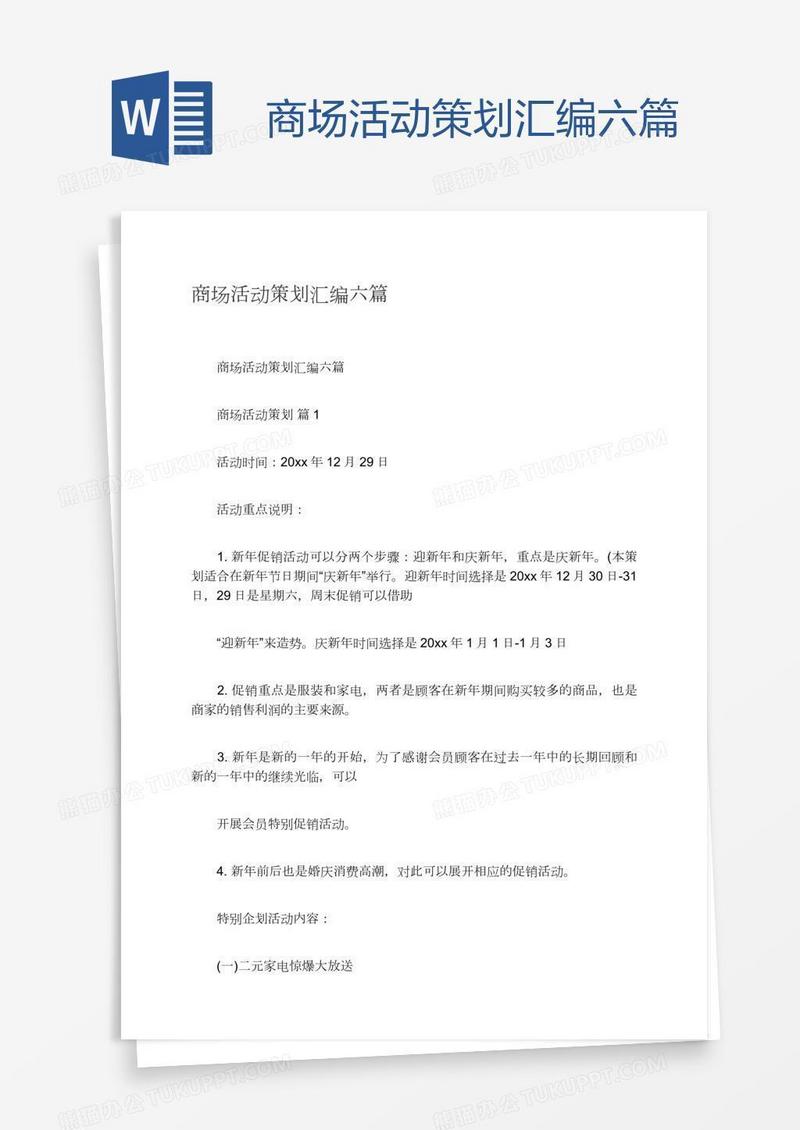 本作品为商场活动策划汇编六篇, 编号:w9jvew6449, 格式为 docx, 大小1 MB, 本作品下载后,先解压,解压之后用推荐软件 Word(2010) 打开, 然后进行编辑功能。