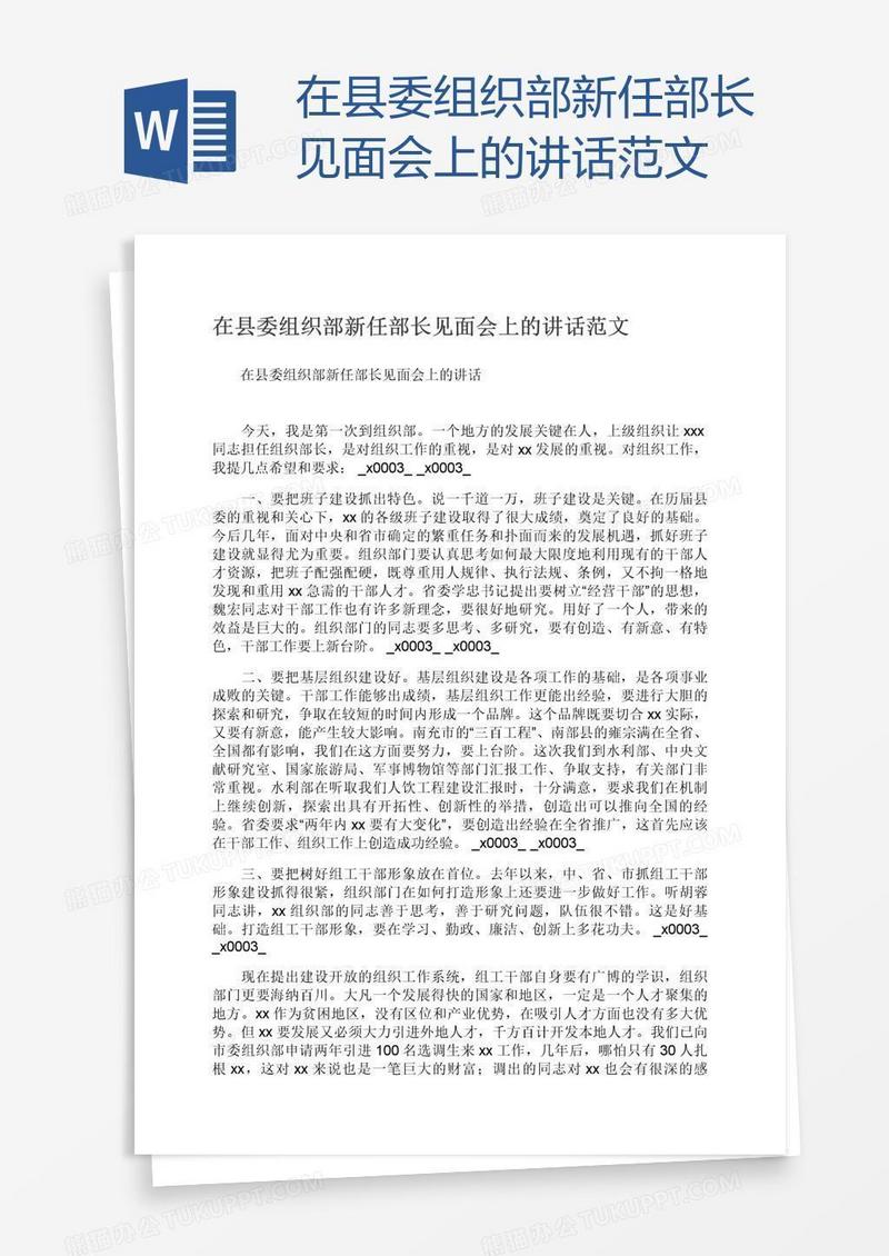 本作品为在县委组织部新任部长见面会上的讲话范文, 编号:w9jvewyqj9, 格式为 docx, 大小1 MB, 本作品下载后,先解压,解压之后用推荐软件 Word(2010) 打开, 然后进行编辑功能。